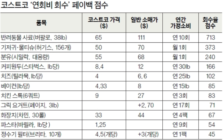 일반 소매점 가격 111달러 수준인 블루버팔로 반려견 사료(38파운드)는 코스트코에서 65달러로 한 번 살 때마다 약 46달러가 절약된다. 연간 10회 구매를 가정하면 회수율 점수는 713에 달한다.