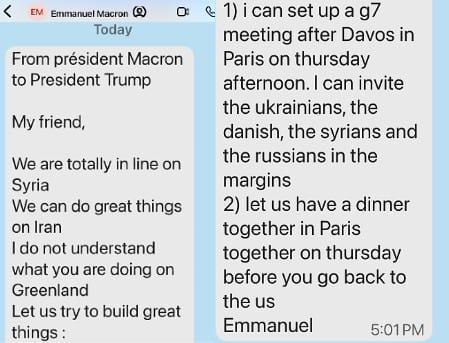 공개된 메시지에서 마크롱 대통령은 트럼프 대통령을 “내 친구”라고 부르며 “우리는 시리아 문제에 대해 완전히 같은 생각이고, 이란 문제에서도 큰 성과를 낼 수 있을 것”이라고 적었다. 그러나 이어 “그린란드 문제에 대해서는 당신이 무엇을 하려는 것인지 이해할 수 없다”고 직격했다.