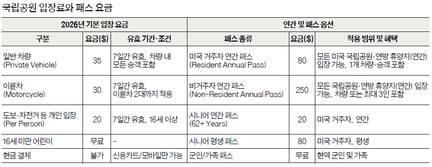 결국 가족이나 친구들과 함께 한 차량으로 국립공원을 방문할 계획이거나 여러 국립공원을 반복적으로 찾을 예정이라면 연간 패스가 유리하다. 1~2명이 단기간에 한 곳의 국립공원만 간다면 일반 입장권이 상대적으로 부담이 적다.