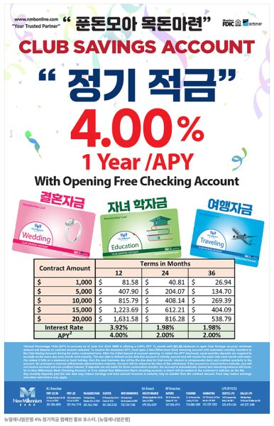 둘루스에 지점을 두고 있는 뉴밀레니엄뱅크(행장 허홍식·점장 캐런 김)는 4월 15일까지 연 4% 이자율을 제공하는 1년 만기 정기적금 캠페인을 실시한다.