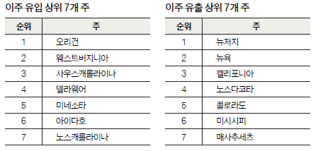 동부도 상황이 비슷했다. 고용이 많지만 생활비가 비싼 뉴욕도 가주와 마찬가지로 유입 42.2%, 유출 57.8%를 기록하며 순유출 상태에 머물렀다. 인근 뉴저지는 전국에서 가장 높은 유출 비율인 62%를 기록했다. 보고서는 이들 주가 젊은 전문직 종사자와 젊은 가정을 끌어들이고 있지만 주거비 부담과 생활 방식에서 은퇴자들은 잃고 있다고 분석했다.