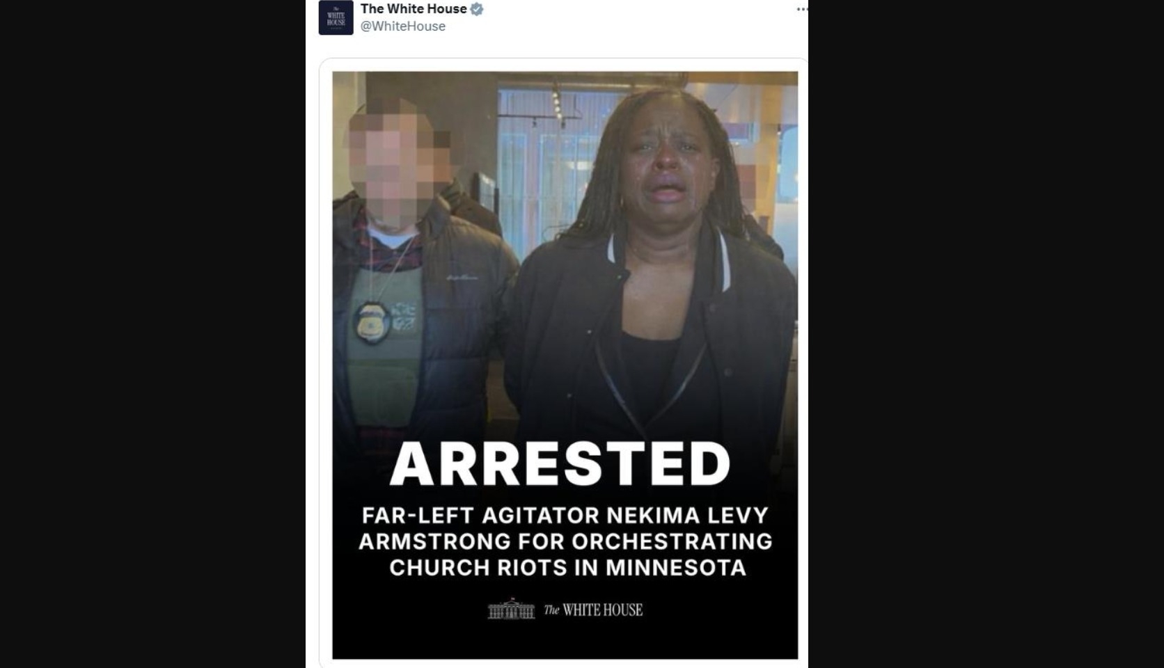 캐롤라인 레빗 백악관 대변인은 놈 장관의 게시물을 공유했고, 곧 백악관도 암스트롱 체포 사진을 X에 올렸다.