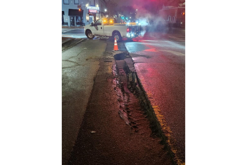 겨울 폭풍이 지나간 뒤 귀넷 카운티 로렌스빌 다운타운 도로에 작은 싱크홀이 발생했다. 경찰은 지난 25일 페리 스트리트에 발생한 싱크홀로 인해 크로건 스트리트에서 파이크 스트리트까지의 도로 폐쇄했다. [로렌스빌 경찰 제공]