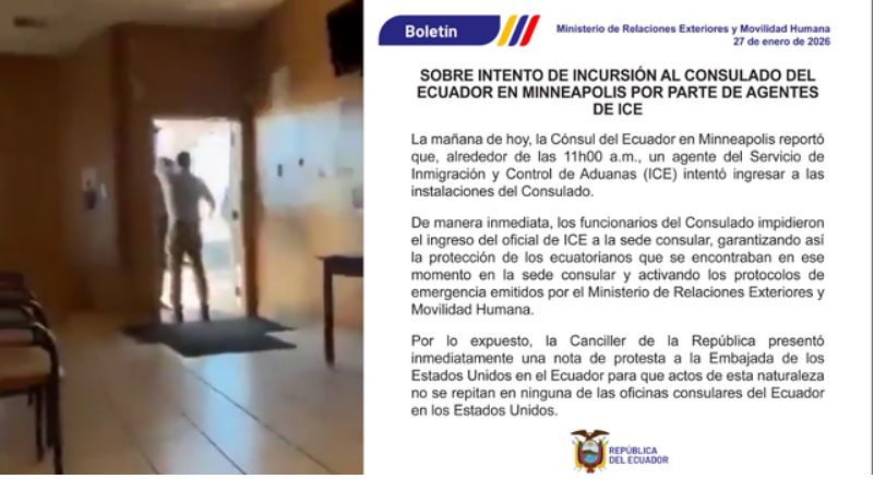 27일 오전 11시쯤 미국 이민세관단속국(ICE) 요원들은 미니애폴리스 소재 에콰도르 영사관 건물에 들어가려다 직원들과 충돌했다.