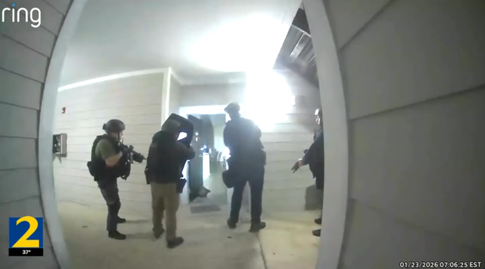 29일 지역방송 WSB-TV 보도에 따르면 이날 방범카메라 영상에는 전술 장비와 방패를 든 경찰관들이 총을 빼 들고 나타나는 모습이 담겼다. 이들은 문을 세게 두드리며 “집 안에 있는 사람은 손을 들고 나오지 않으면 문을 부수겠다”라고 외쳤다.
