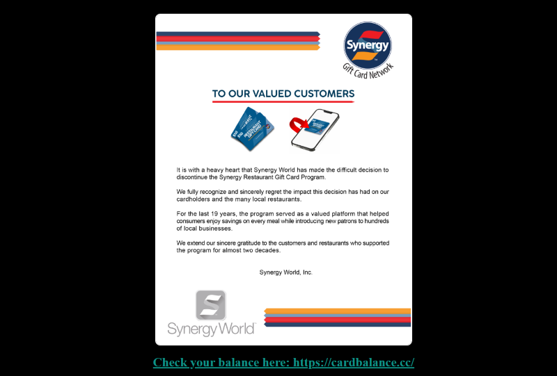 시너지 월드는 최근 챕터7 파산보호를 신청하고 영업을 전면 중단했다. 이에 따라 해당 기프트카드는 캘리포니아 포함 전국 제휴 레스토랑(최대 400여곳)에서 더는 사용할 수 없는 상태다.