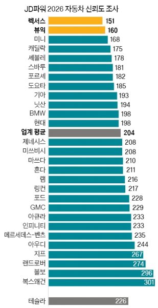 시장조사업체 JD파워가 최근 발표한 2026년 차량 신뢰도 평가에 따르면, 올해 1위 자동차 브랜드는 렉서스로 4년 연속 1위를 차지했다. 〈그래프 참조〉