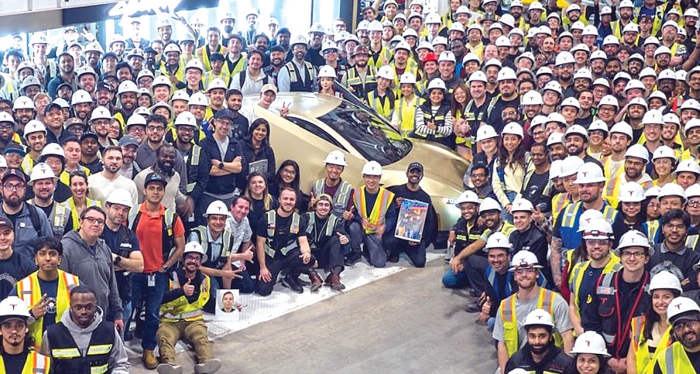 테슬라는 지난 17일 엑스(X) 게시물을 통해 자율주행 로보(무인)택시 차량인 사이버캡이 텍사스 오스틴에 위치한 테슬라 기가팩토리 생산라인에서 출고됐다고 밝혔다. 테슬라는 지난 1월부터 일반 대중을 상대로 제한적인 수의 ‘무인’ 주행 서비스를 제공하기 시작했다. 사이버캡은 운전대나 페달이 없으며, 완전 자율주행을 목적으로 제작됐다. 기가팩토리 직원들이 첫 출고차와 함께 자축하고 있다. [테슬라 제공]