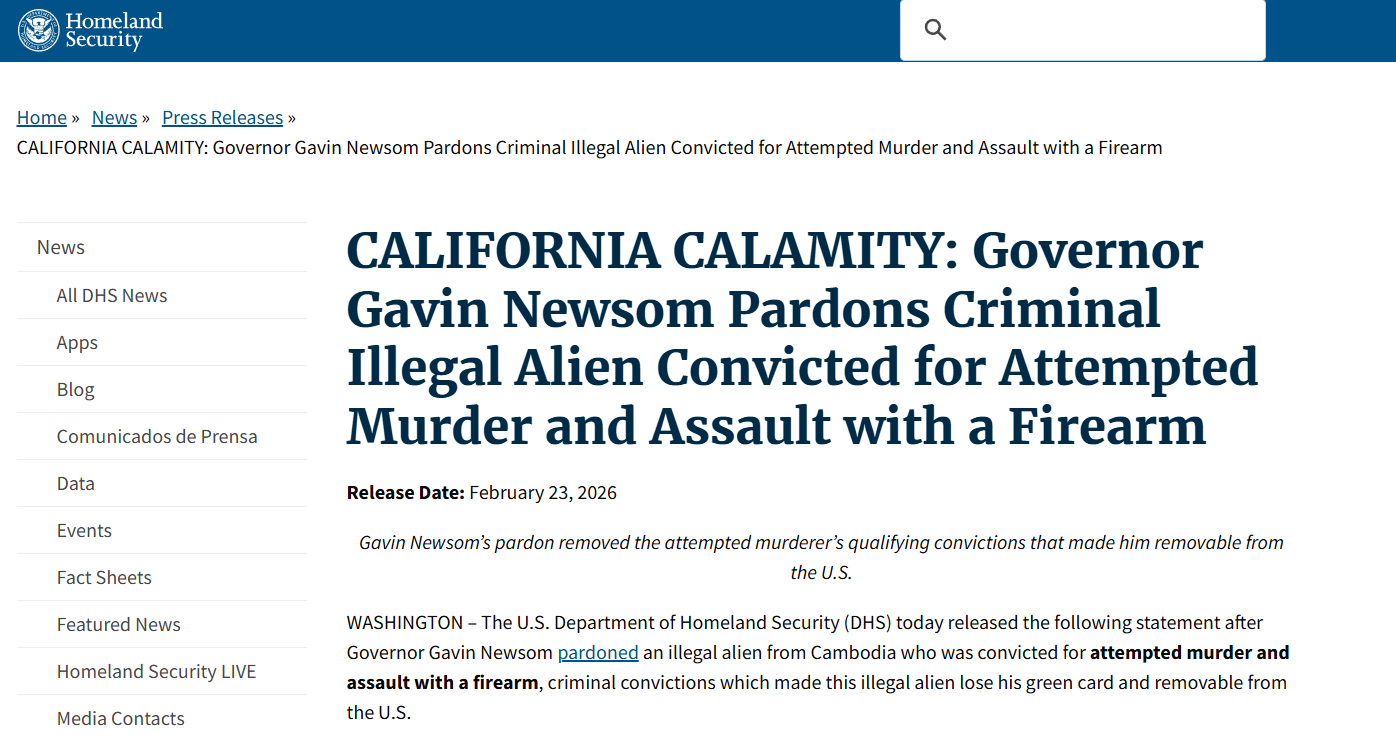 논란의 중심에는 개빈 뉴섬 가주 주지사의 사면 결정이 있다. DHS는 뉴섬 주지사가 살인미수와 총기 폭행 전력이 있는 캄보디아 출신 솜분 파이마니를 사면했다고 전했다. 이에 따라 기존 추방 명령의 법적 근거가 사라지면서 그는 즉각적인 강제 출국 대신 이민 절차를 다시 밟게 됐다.