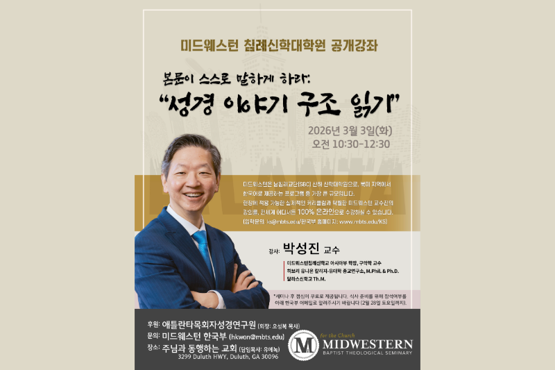 미드웨스턴 침례신학대학원은 다음달 3일 화요일 오전 10시 30분부터 둘루스 주님과 동행하는 교회에서 공개강좌를 갖는다.