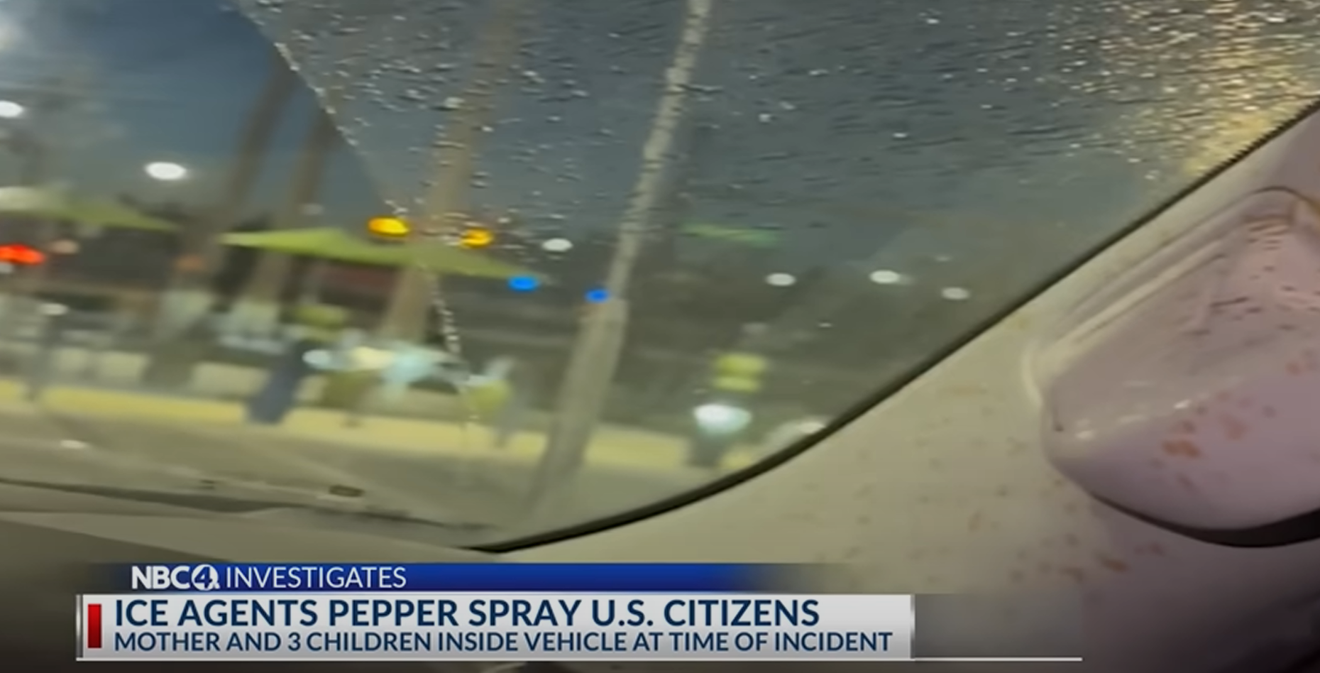 영상에는 이후 ICE 차량이 차선을 넘나들며 신호를 위반해 고속도로로 진입하는 장면도 포착됐다. 차량 내부에는 주황색 페퍼스프레이 잔여물이 남았고, 아이들은 기침과 피부 화끈거림을 호소했다.