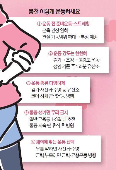 이러한 생활 패턴은 근력 감소와 체력 저하로 이어지기 쉽다. 그러다가 날씨가 따뜻해지면서 갑자기 운동을 시작하면 근육과 관절이 충분히 준비되지 않은 상태에서 부담을 받게 된다.