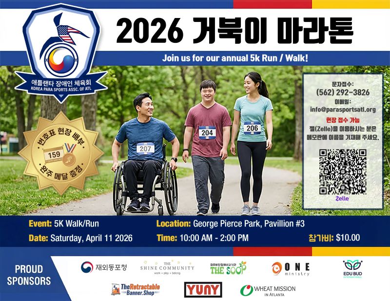 애틀랜타 장애인체육회(회장 박승범)는 내달 11일 오후 2시부터 스와니 조지 피어스 공원에서 ‘2026 5K 마라톤’을 개최한다.