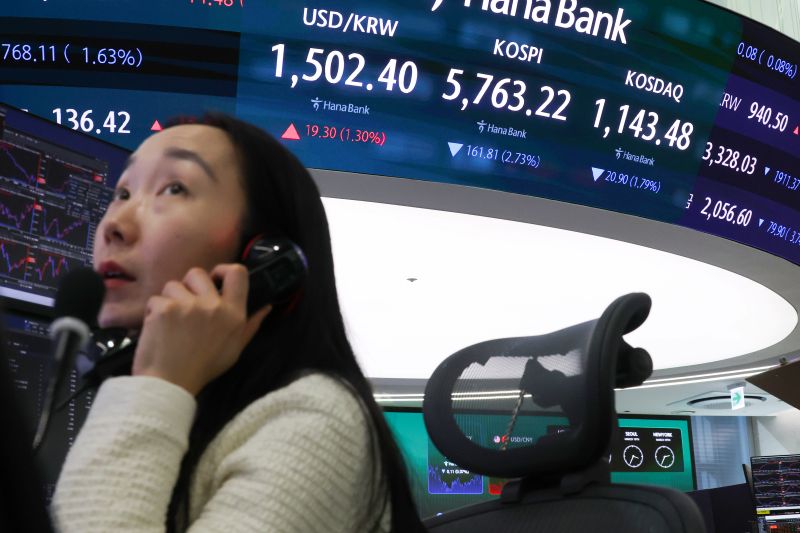4일 중구 하나은행 본점 딜링룸 전광판에 실시간 코스피와 원/달러 환율이 표시돼 있다. [연합뉴스 사진]