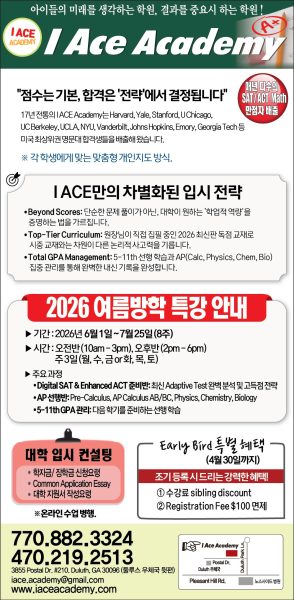 둘루스 ‘아이 에이스 아카데미'(I Ace Academy·3855 Postal Dr. #210)는 6월 1일부터 7월 25일까지 8주간 진행되는 여름방학 특강 수강생을 모집한다. 대학 입시 컨설팅도 진행하며, 4월 30일까지 접수하는 사람에게는 수강료 할인 등의 혜택을 제공한다. 학원은 “하버드, 예일, 스탠포드, 벤더빌트 등 미국 최상위권 명문대 합격생들을 배출해왔다”고 밝혔다. 문의=770-882-3324
