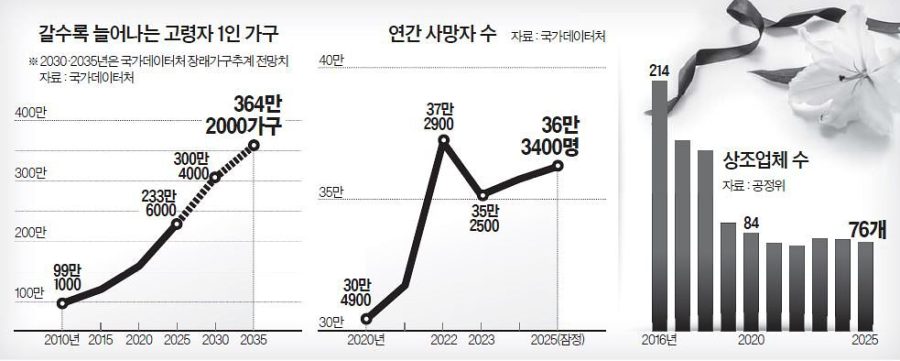 전문가들은 장례 간소화 추세는 앞으로도 지속될 것으로 내다보고 있다. 실제로 국내 연간 사망자 수는 2010년 25만5400명에서 2020년 30만4900명, 지난해 36만3400명으로 증가 추세인 데 비해 출산율 감소로 65세 미만 인구 비중은 갈수록 줄어들고 있는 상황이다. 한국장례문화진흥원 관계자는 “저출산 고령화가 심화되는 추세 속에서 고령 사망자는 늘지만 이들을 돌봐야 하는 인구는 감소할 것으로 예상되는 만큼 지금의 장례식 간소화 현상은 더욱 확산될 가능성이 크다”고 전망했다.