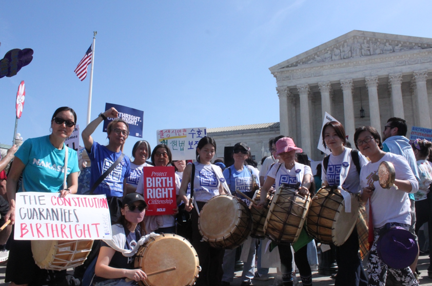 시위대 한복판에서 구호에 맞춰 북과 꽹과리 소리가 크게 들렸다. ‘출생시민권 수호, 현 헌법 보장’이라고 한국어로 적힌 피켓도 보였다.