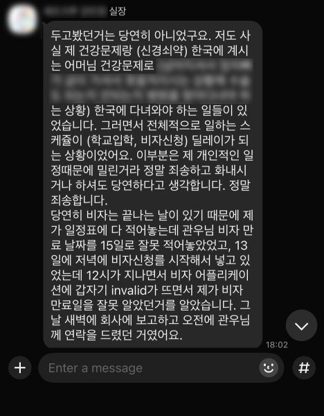 지난해 9월 유학원 관계자와 박관우씨가 나눈 대화. 유학원 측은 박씨의 비자 신청을 빠트린 데 대해 그동안 직원의 개인 사정으로 업무가 밀렸고 직원이 비자 신청일을 착각했기 때문이라고 설명했다. 사진 박관우씨 제공