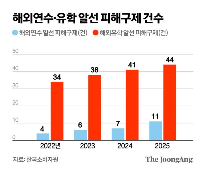 유학원을 통해 해외 유학을 떠나는 사람이 계속 늘어나면서 박씨처럼 해외 연수와 유학 알선 관련 분쟁을 겪는 사례도 잇따르고 있다. 한국소비자원에 따르면 2022~2025년 해외연수알선 부문 피해구제 건수는 4→6→7→11건으로 매해 늘어나는 추세다. 같은 기간 해외유학알선 피해구제 건수도 34→38→41→44건으로 증가했다.