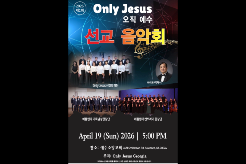 ‘오직 예수 선교 음악회’에는 오직예수 선교합창단, 이재식 바리톤, 애틀랜타 기독남성합창단, 애틀랜타 칸토라이합창단이 출연한다.