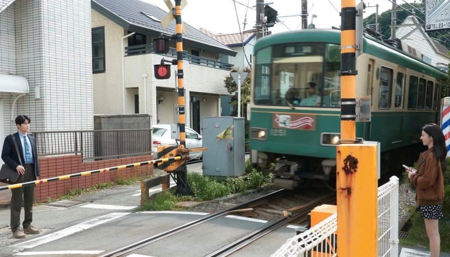 배우 김선호(왼쪽), 고윤정 주연의 넷플릭스 드라마 ‘이 사랑 통역 되나요?’에 등장한 일본 가나가와현 가마쿠라 주택가 옆 철도 건널목.