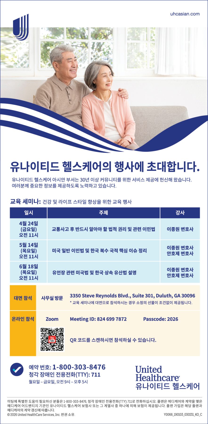 건강보험사인 유나이티드 헬스케어 아시안 부서가 4~6월 세 달 간 건강 및 라이프 스타일 향상을 위한 교육 세미나를 개최한다. 먼저 이달 24일에는 이종원 변호사를 초청해 교통사고 후 반드시 알아야 할 법적 권리와 관련 이민법을 설명한다. 5월과 6월에는 각각 이민법 및 한국 복수 국적법, 유언장 및 상속 유산법 설명회가 예정돼 있다. 대면 또는 온라인 참석이 가능하다. ▶세미나 예약=1-800-303-8476