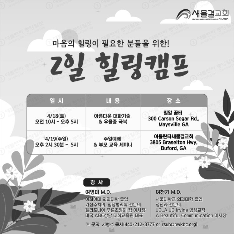 뷰포드에 위치한 아틀란타 새물결교회가 18~19일 이틀간 힐링캠프를 연다. 캘리포니아주의 여명미 가정주치의와 여천기 정신과 전문의가 강사로 나서 밀알 꿈터에서 아름다운 대화 기술과 우울증 극복을 주제로 강연할 예정이다. 주일 예배 후에는 부모 교육 세미나도 열린다. ▶문의=서형석 목사 440-212-3777, rsuh@nwkbc.org