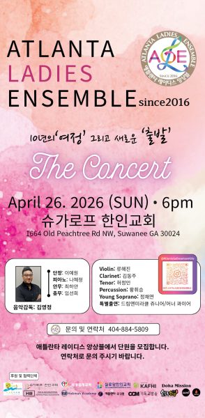 2016년 결성돼 올해로 10주년을 맞은 애틀란타 레이디스 앙상블이 26일 슈가로프 한인 교회에서 ’10년의 여정 그리고 새로운 출발’을 주제로 콘서트를 연다. 김영정 음악감독, 이예원 단장, 나혜정 피아니스트, 류해진 바이올리니스트, 허정민 테너, 김동주 클라리네티스트 등이 무대에 오른다. 애틀란타 레이디스 앙상블은 신규 단원도 모집 중이다. ▶문의=404-884-5809