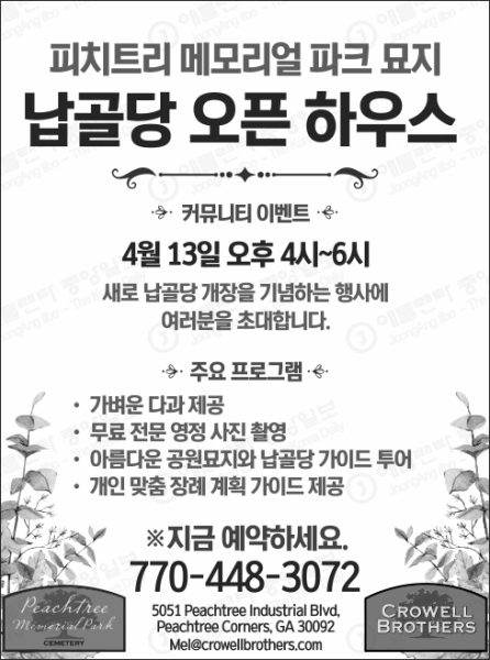 피치트리코너스에 위치한 피치트리 메모리얼 파크가 13일 납골당 개장 기념 오픈하우스 행사를 개최한다. 업체는 이날 방문객을 위해 전문 영정 사진을 무료로 촬영해주고 개인 맞춤 장례 계획 상담도 제공할 방침이다. ▶문의=770-448-3072