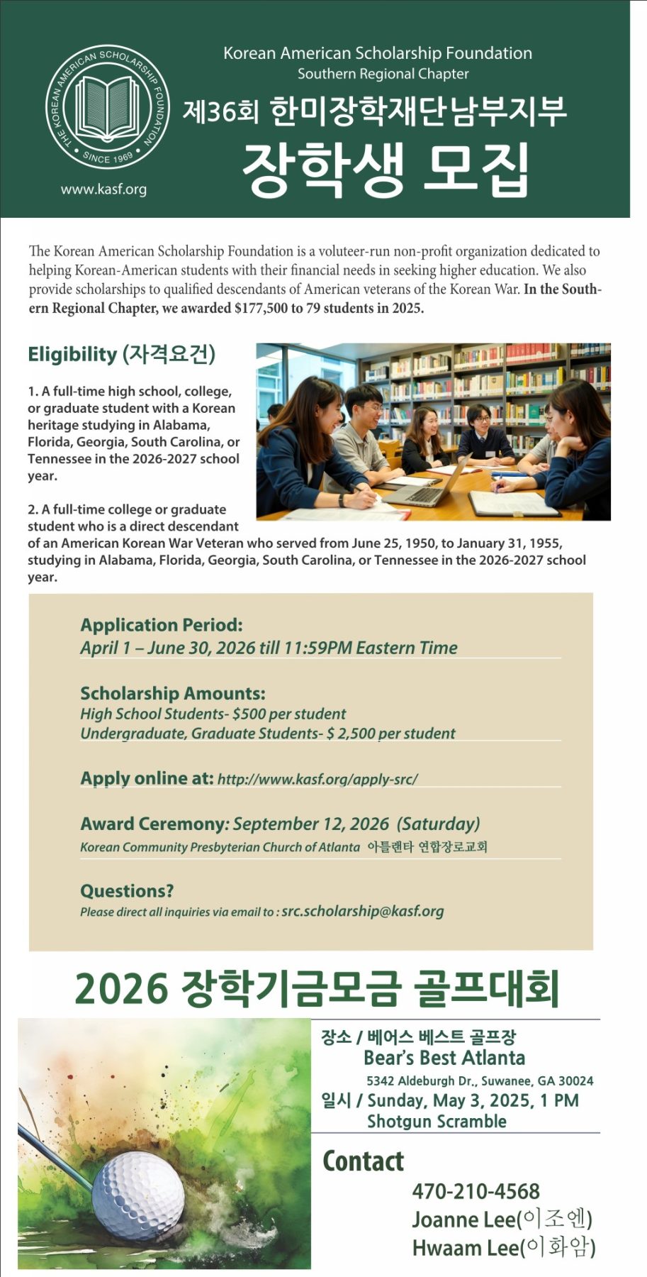 한미장학재단 남부지부가 제36회 장학생을 모집한다. 조지아주를 비롯해 앨라배마, 플로리다, 테네시, 사우스 캐롤라이나 등 5개 주에 거주하는 고등학생 및 대학(원)생은 6월 30일까지 지원 가능하다. 고등학생은 500달러, 대학(원)생은 2500달러의 장학금이 지원된다. 재단은 장학기금 모금을 위해 내달 3일 베어스 베스트 골프장에서 골프대회도 개최한다.