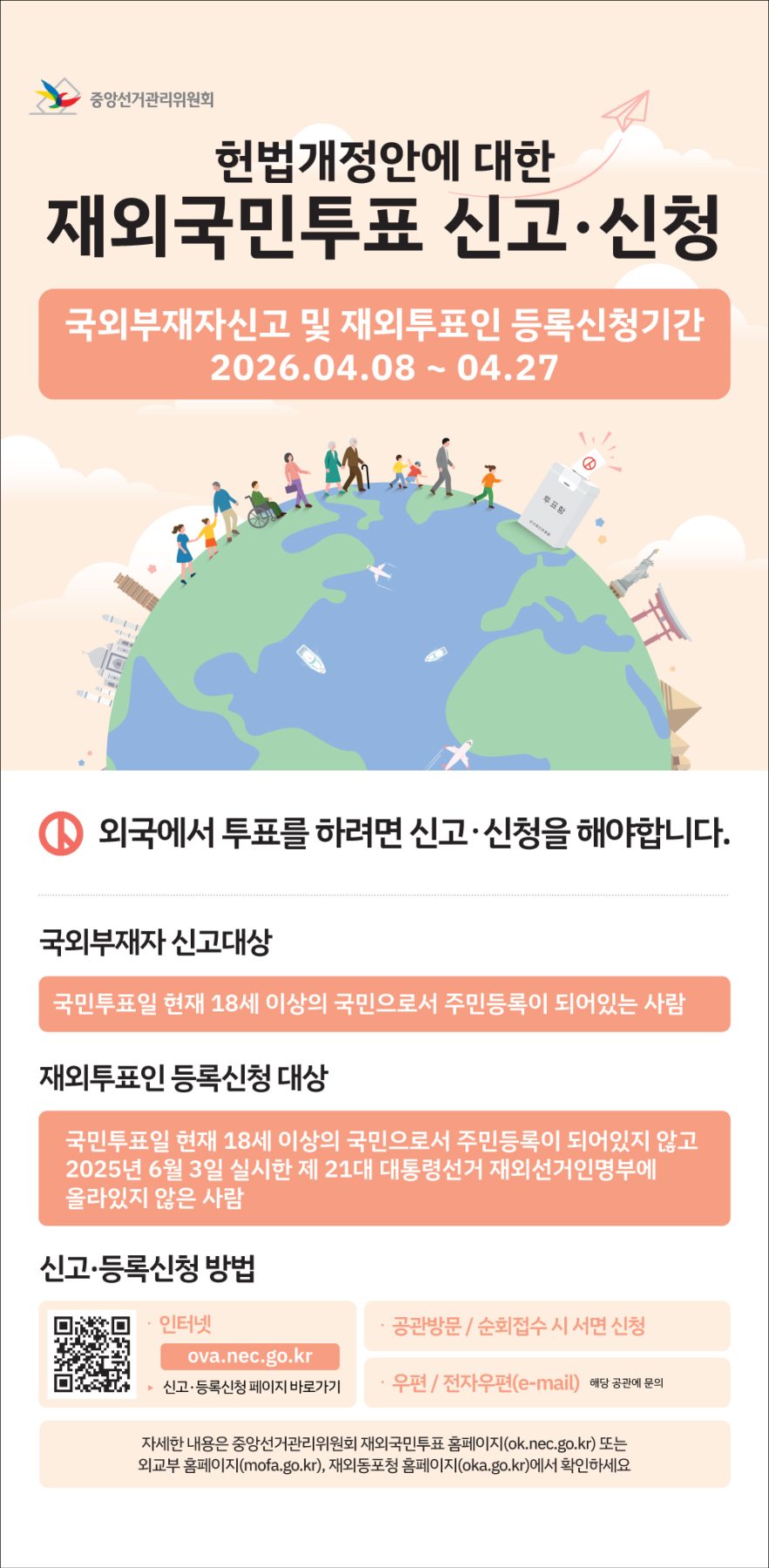 재외국민이 국민투표에 참여하려면 오는 27일까지 서면, 전자우편, 재외선거 홈페이지(ova.nec.go.kr)를 통해 신청하면 된다.