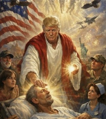앞서 트럼프 대통령은 지난 12일 흰옷을 입고 붉은 망토를 걸친 채 병든 누군가의 이마에 손을 얹은 자신의 이미지를 올렸다.