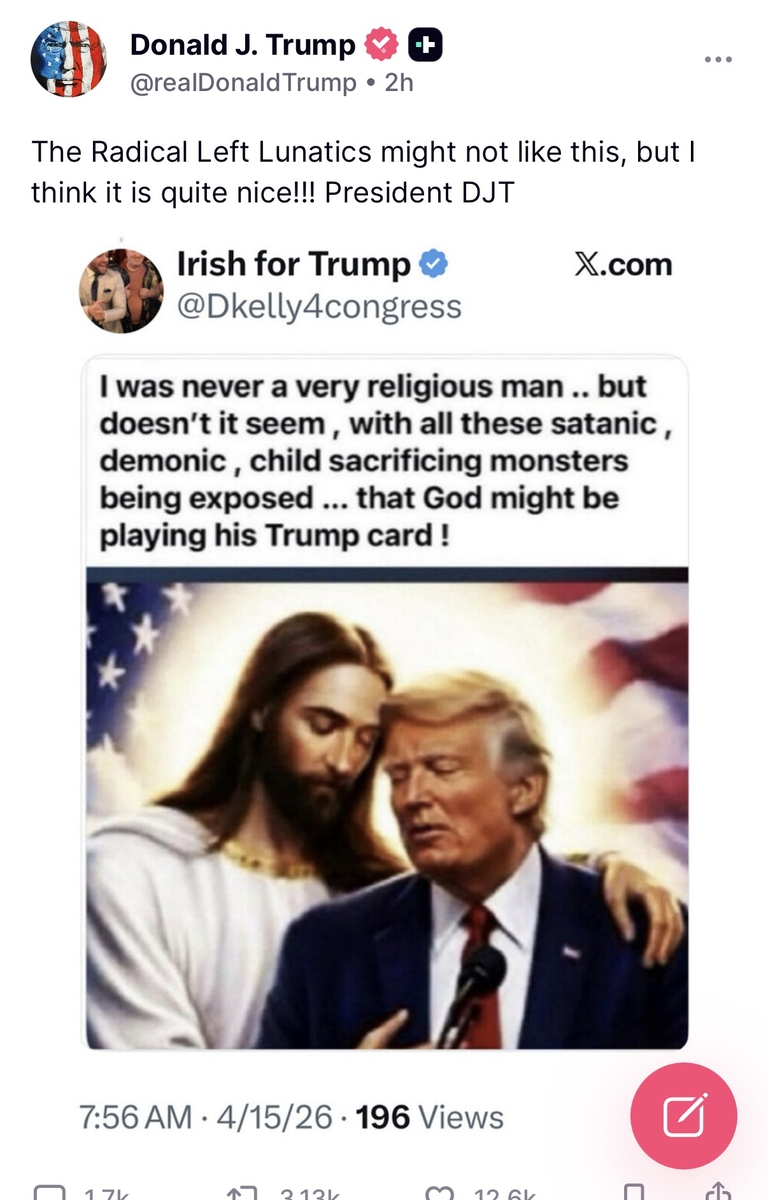 도널드 트럼프 미국 대통령이 15일 소셜미디어에 예수에게 안겨 있는 자신의 이미지를 공유했다.