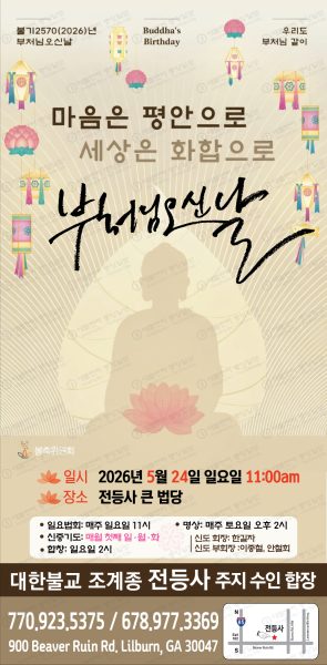 릴번에 위치한 대한불교 조계종 전등사가 불기 2570년을 맞아 전등사 큰법당에서 내달 24일 연등회 행사를 연다. 올해 봉축 표어는 ‘마음은 평안으로, 세상은 화합으로’다. 최근 국제적 대립과 전쟁으로 갈등이 심화되는 상황에서 현대인의 지친 마음을 어루만져 공동체 화합을 이끌어내겠다는 뜻을 담았다. ▶문의=770-923-5375