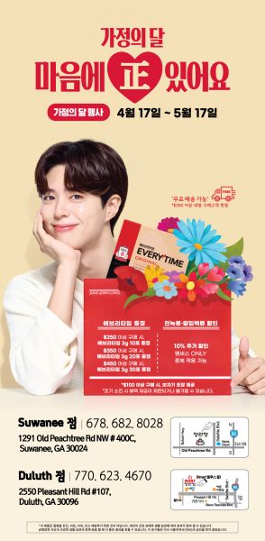 정관장이 내달 17일까지 인기 브랜드 ‘에브리타임’ 등의 가정의달 맞이 캠페인을 진행한다. 250달러, 350달러, 450달러 이상 구매시 에브리타임 3g을 각각 10포, 20포, 30포 증정한다. 또 천녹류와 달임액류를 10% 추가 할인한다. 100달러 이상 구매 시 보자기 포장을 제공한다. 정관장은 조지아주에 스와니와 둘루스 지점을 두고 있다. ▶문의=스와니점 678-682-8028, 둘루스점 770-623-4670