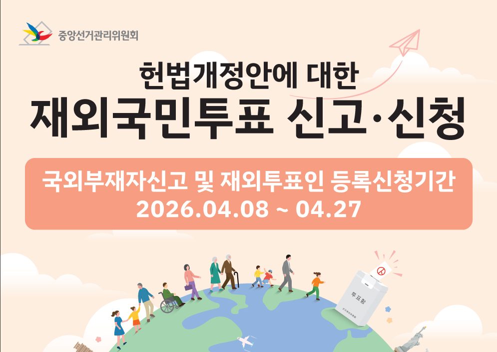 애틀랜타 총영사관은 오는 27일까지 헌법개정안에 대한 재외국민투표를 위한 신고 및 신청을 받고 있다. 18세 이상의 국민으로서 주민등록이 되어 있는 사람은 국외부재자 신고 대상이며 주민등록이 되지 있지 않고, 지난 2025년 실시한 대통령선거 선거인명부에 올라있지 않은 사람은 따로 재외투표인 등록신청을 해야 한다. 중앙선거관리위원회 재외국민투표 홈페이지를 접속하거나 공관을 방문해 신청할 수 있다.