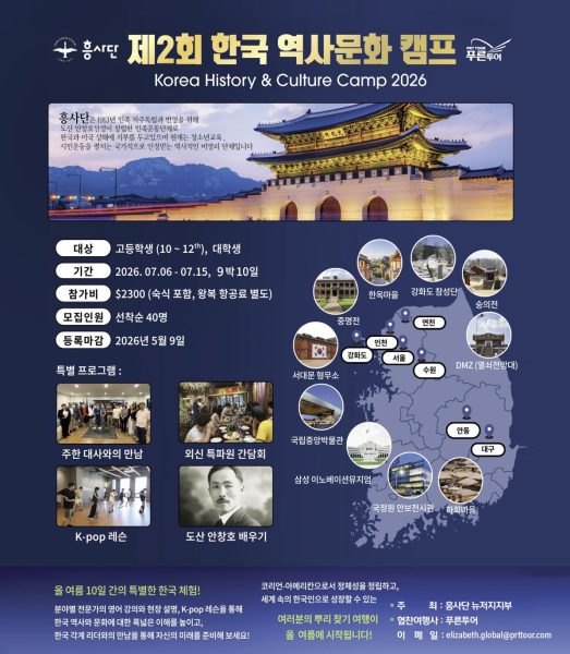 푸른투어(대표 문 조)가 흥사단과 함께 한인 2세 청소년을 위한 ‘한국 역사문화 캠프’를 개최한다. 7월 6일부터 15일까지 9박 10일 일정(한국 도착 기준)으로 한국의 주요 도시를 아우르는 교육형 프로그램이다. 종묘, 몽촌토성, 서대문형무소, 마니산 참성단, DMZ 열쇠전망대, 국립중앙박물관, 안동 하회마을 등 12곳을 탐방하며 주한 외국 대사, 주한 외신 특파원과의 만남, K팝 댄스 레슨 등 알찬 체험도 포함돼 있다. 참가비는 2300달러(항공료 별도)다. ▶문의=201-778-4000, Local@prttour.com
