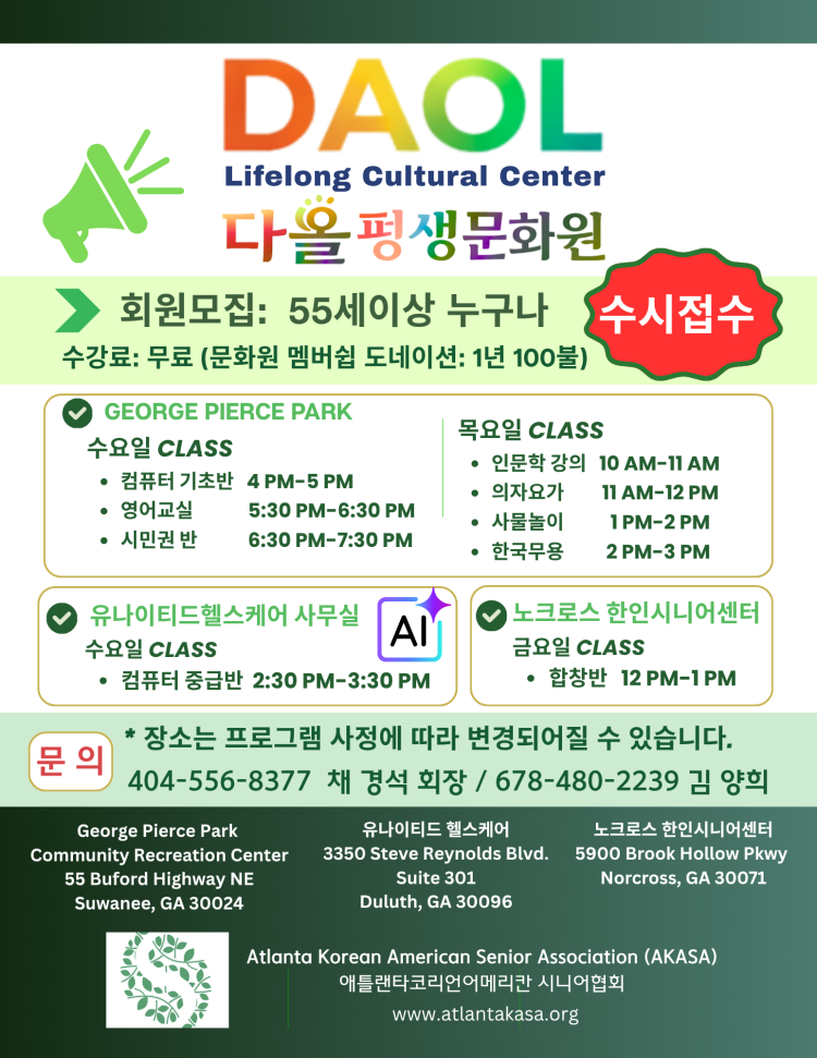 애틀랜타 한인노인회(회장 채경석) 산하 다올 평생문화교육원이 인공지능(AI)에 익숙하지 않은 55세 이상 시니어를 위한 교육 프로그램을 진행한다.