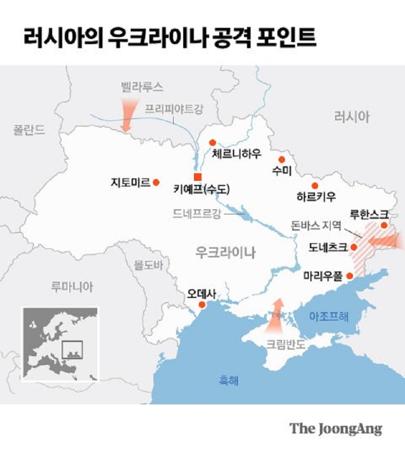 – 언제 어딜 공격한 것인가= 러시아군은 동부와 북부, 남부 등 3개면을 통해 동시다발 공격을 펼치며 우크라이나로 진격했다. 동부 돈바스 지역에선 러시아군의 지원을 받는 친러 분리주의 반군이 우크라이나 정부군의 방어선을 뚫고 6~8km 진군했다고 러시아 국방부가 밝혔다. 남부에선 러시아가 지난 2014년 합병한 크림반도를 통해 진입한 러시아 공수부대와 기갑부대 등이 우크라이나 남부 도시 헤르손에 입성한 것으로 알려졌다. 러시아군은 또 우크라이나 북부 벨라루스 쪽에서 남쪽으로 진군하며 국경에서 멀지 않은 우크라이나 북부의 체르노빌 원전을 점령했다고 밝혔다.