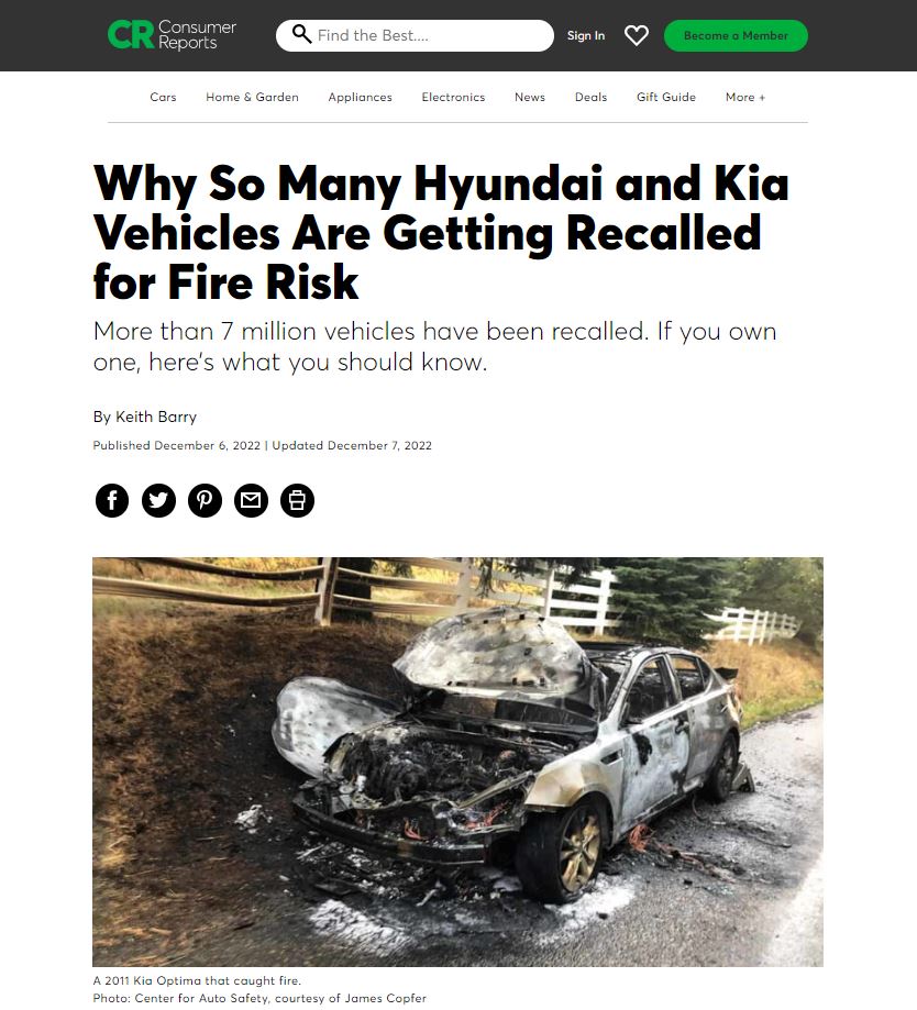 컨수머리포트와 CAC의 자료에 의하면 현대차와 기아는 지난 12년간 약 700만 대의 차량을 대상으로 화재 위험 리콜을 통지했다. 올해에만 120만 대가 넘는 차량이 리콜됐다.