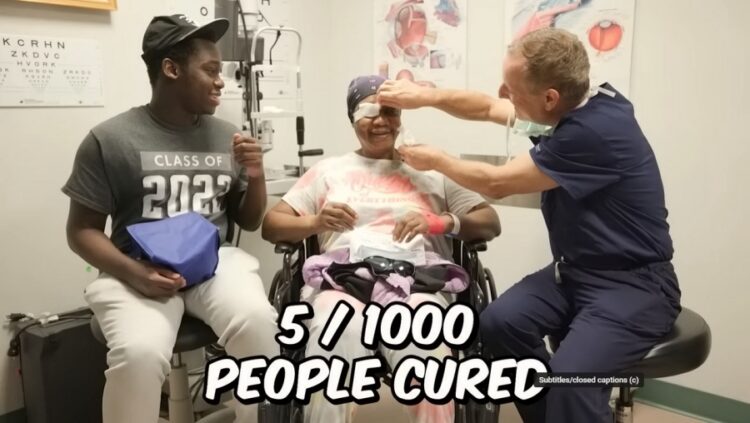 미스터 비스트의 시각 장애인 의료지원 이벤트의 한 장면. 수술 후 환자가 거즈를 풀고 있다. 유튜브 영상 캡처