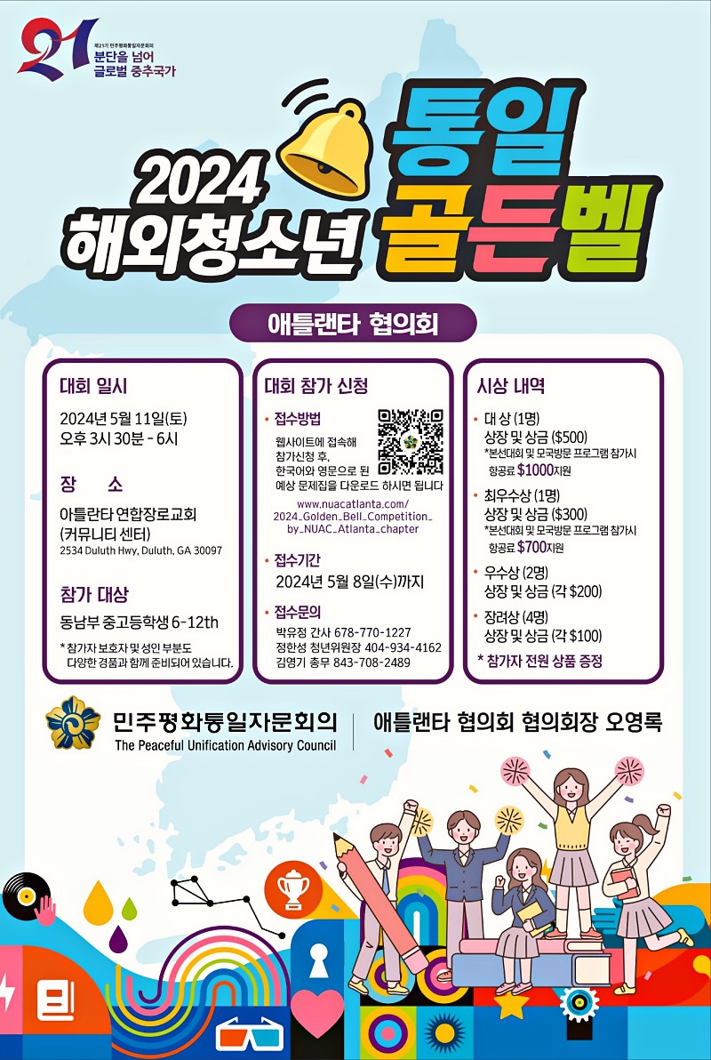 민주평화통일자문회의 애틀랜타협의회는 내달 11일 오후 3시 30부 아틀란타 연합장로교회 커뮤니티센터에서 2024 해외청소년 통일 골든벨을 개최하며 5월 8일까지 참가신청을 받는다. 동남부 중·고등학생 6~12학년이 참가할 수 있으며, 대상은 상장과 상금 500달러를 받는다. 홈페이지에 올라와 있는 예상 문제집으로 골든벨을 준비할 수 있다. 문의=678-770-1227