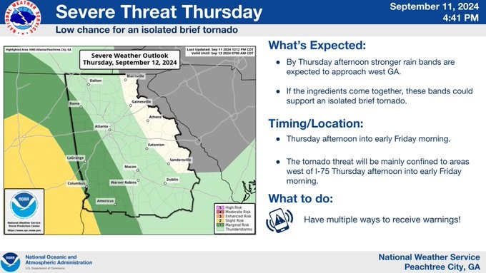 기상청(NWS)은 조지아주 서부 대부분 지역에 13일 저녁까지 홍수 주의보를 발령했으며, 최대 6인치 비가 내릴 것으로 예보했다. 또 국지성의 짧은 토네이도가 발생할 가능성도 있다.