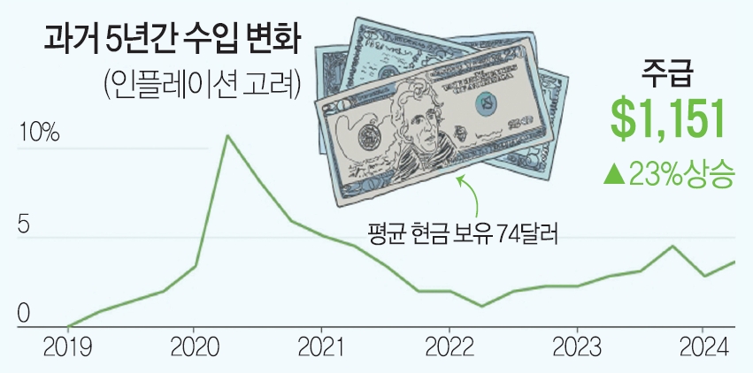 점점 현금을 들고 다니지 않는 사회로 변화하고 있으나 실제로는 소비자들의 지갑에 있는 현금은 60달러에서 74달러로 늘어 눈길을 끈다. 이렇게 지갑이 조금이나마 두둑해진 이유는 수입이 늘어났기 때문이다. 소비자들의 평균 연 수입은 2019년에 비해 23% 증가했다. 특히 팬데믹이 한창인 2020년과 2021년 사이에는 10% 이상 상승하며 증가 폭이 두드러졌다.
