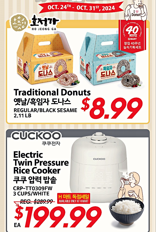 오는 31일까지 H 마트에서만(H 마트 독점세일) 정가 289.99달러인 쿠쿠 압력밥솥(CRP-TT0309FW)을 199.99달러에 구매할 수 있다. 또 호정가의 옛날/흑임자 도나스를 8.99달러에 만나볼 수 있다.