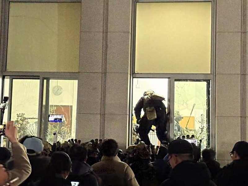 4일 오전 0시 35분쯤 무장군인들이 창문을 깨고 국회 본관 안으로 진입하고 있다. 이아미 기자