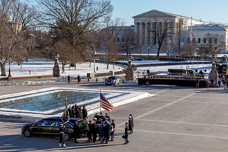 카터 전 대통령의 영구가 국회의사당에서 국립대성당으로 이동하기 위해 운구차에 실리고 있다. 로이터